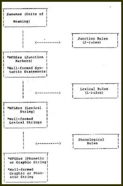 To make a long story short, the meta-model of human intelligence of which J-rules are but a part is presumed to interact with the deep representations of JG (we refer to them as WFSSes, but you may think of them as junction markers if you like), to generate a great deal of information not explicitly represented by them. Notice that the hypothesis that deep representations stimulate more information than they contain is useful in explaining why the same sentence may "mean" different things to different people. It is interesting also to note that this hypothesis is somewhat akin to the notion of semantic interpretation proposed by certain transformationalists who oppose GS (they call themselves interpretive semanticists), but the formal mechanisms of JG for its implementation are very much different than those proposed by interpretive semantics (IS). (Jackendoff, 1972) Let us now turn to IS briefly.