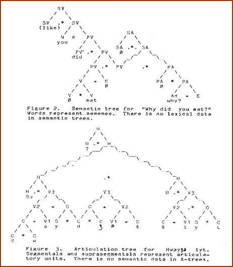 Let us digress momentarily to clarify the nature of articulatory lexemes in junction grammar. They are, in effect, phonological representations that may be viewed as instructions to a vocal tract analogue. However, these phonological representations are not the kind used in standard generative phonology, being junction trees themselves, but of a different type. The information they contain is strictly phonological, depicting how phonemes are joined to form syllables, how syllables are joined to form words, how words are joined to form phrases, and how phrases are joined to form the larger articulatory units we call sentences. Thus, while semantic junction trees depict the relationship of semantic constituents, articulatory junction trees depict the relationship of articulatory constituents.