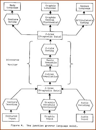 Thus, from the inside out, a need stimulates the generation of a junction tree; this tree is custom-made to satisfy the need in the context of a specific discourse environment. The lexical coding grammar interprets the semantic tree and codes up an articulatory junction tree corresponding to it. The junctions in this tree are then executed by the vocal tract to produce the acoustic signal we refer to as live speech. Concurrently, other coding grammars may also access the semantic tree and code up motor instructions for those parts of the body which participate in body language. Figure 4 depicts the model described.