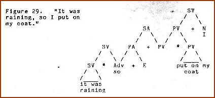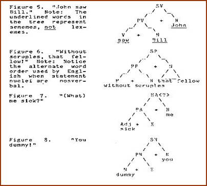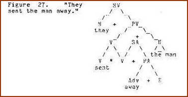 We observe that the semantic tree on the first display, while augmented with ordering and hiatus markers, has not otherwise been altered or transformed. The lexical string on the second display bears a coding relation to the semantic tree, not a transformational relation. The coding grammar, in conjunction with more powerful base rules, has supplanted the customary component of T-rules.