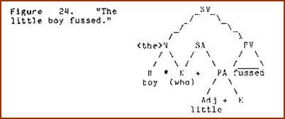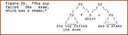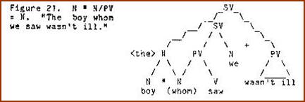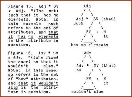 Several years ago we devised a computer program which, given the set of sememe categories used in semantic junction trees, generated the rule schema corresponding to the full subjunction formula X * Y = Z. All of the rules exemplified so far were generated by that program and easily verified by data. However, another rule, V * SV = V was also generated. Since no one could readily associate this junction with available natural language data, we attempted to impose a constraint on the program to exclude it from the schema. This was frustrating, however, because every constraint devised also excluded rules which were valid. Finally it occurred to me that the problem rule (V * SV = V) was as easily verifiable as the others. We had simply been ignorant of the grammatical relation expressed by this rule. The structure in question corresponds to those cases where a statement is an instance of a linguistic act of some kind. For example, in "My tummy hurts,” Johnny whined, my tummy hurts IS the whining referred to by whined(Figure 17).