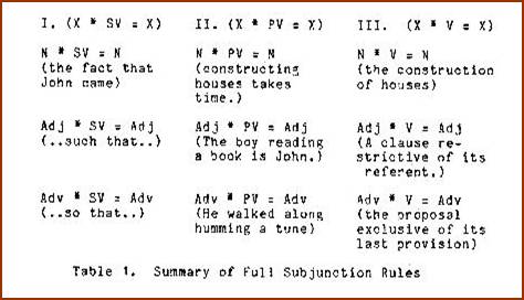 To make a long story short, full subjunction corresponds to the rule schema X * Y = Z, which subtends sentential complements, participles in all their variety (both active and passive), action nominals, and other less frequently discussed derived forms. It also includes one other construction type of particular interest which we now consider because it points up an important property of junction rule schemata, namely, their predictive power.