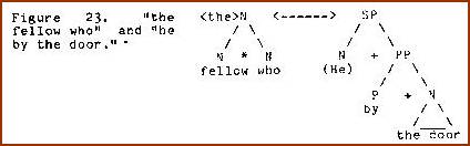 Notice that the intersect node in Figure 22 is glossed with who. This constitutes a claim that phrasal modifiers are lexical manifestations of semantic structure parallel to that of clauses. The underlying interjunction is between the head and a prepositional statement whose subject has the same identity as the fellow in question. The co-reference of who and he is depicted in Figure 23. The sense of restriction that one feels from the modification stems from the subjunction of a sememe referring to an individual (who) to a class (fellow).