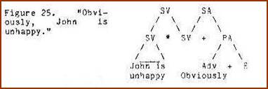 Adverbial modifiers have the same basic structure but are interjoined to constituents which are not nouns. For example, an adverb modifying an entire statement would be given as an adverbial statement interjoined to the statement (Figure 25). No word is realized for the intersect node of these and other similar structures, but must be present in the tree to account for their semantic effect: