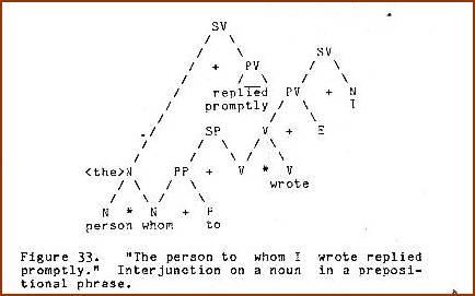 Interjunctions are as prolific in their variety as full subjunctions. Let us consider some more examples. In Figure 21, the relative clause intersects on the direct object of its verb, thus yielding whom rather thanwho at the intersect.
