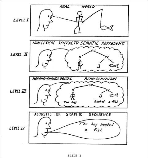 Let me talk for a few moments about one or two aspects of the theory, and I will be finished. It should be noted that all of the rules of this grammar are computable; in other words, because of the fixed nature of these rules, the kinds of rules with the constraints imposed on them can be fed into a computer, and every possible variation of the rule can be computed. This is in contrast to theories that are being developed today in linguistics where the set of rules needed to produce language is an open-ended set - we see no end to the number of rules we will need. In Junction Grammar, there is a fixed number of rules available. This is not to suggest that all languages utilize all of these rules, however. The set of rules is considered a universal set from which all languages of the world draw to generate their sentences, one particular language using this given subset of the universal set, another language using a different subset of this computable set of rules, and so on. It is interesting to note another ramification of this particular thing. I need to build a little background for it before I can come back to this idea of languages utilizing a universal set of rules. In many sentences we note a concept or phenomenon referred to as syntactic inversion. Take a sentence like the one that Dr. Lytle has used previously: The car that the truck had hit rolled over. You can invert this sentence, such that it is expressed The truck had hit the car that rolled over. Or, I carried an umbrella because it was raining. -- It was raining so I carried an umbrella. The one sentence is the inverse of the other. Now it turns out that in English we have both possibilities as I have illustrated with these pairs I have cited for you. But this is not necessarily the case in all languages. It is my understanding, for example, that Japanese has available only those rules which will give one of these pairs. And so in the translation process that Dr. Lytle is involved in here - if one of these sentences goes into the computer and Japanese does not have that particular construction, the inverse of it is available, and can be generated by the computer. And we lose little or nothing in the process of translation. A final comment about the lexical rules: these are the rules that take us from level II to level III. There are four types of rules here, and their names are somewhat self-explanatory. Let me just indicate briefly how they function. We need to remember that, at level II, these diagrams we have seen are kind of free-wheeling mobiles - no order to them. And it is not like boy hits girl is at level II; all we have at level II are the unitsboy, girl, and hit, related to each other in certain syntactic configurations but not ordered as they come out of our mouth. Obviously we have to speak in some linear sequence (we haven't found any other way yet) and so we need the lexical ordering rules to impose a fixed word order on these elements according to the constraints of individual languages. And since each language has a different set of ordering rules, we have to write, for each language, a set of Lexical-ordering rules which take us from level II to level III. Lexical hiatus rules - the second type - are rules which specify non-lexicalization of elements which are understood. For example, in an imperative like Go home!, we often say that the you subject is understood. These L-H (for lexical hiatus) rules are the rules which allow for this recognition of understood elements on this lower level of language production and allow for these elements not being lexically realized in the string that is produced. The lexical matching rules actually match up with the mental concepts of level II the given word from a particular language which will express that mental concept. In our first diagram (Slide 1), the mental concepts of the boy, catching, and fish need the words attached to them which correspond to these concepts, which is what the matching rules do. Finally there are lexical agreement rules which tack on all the different types of agreement affixes that we note in inflected languages of the world, such as Spanish, German or Russian. In English these rules put the third-person singular ending on verbs according to the third-person quality of the noun, for example. These rules will also attach number or gender markers in such languages as Spanish or German - these outward trappings that we need before we can get to the final utterance.