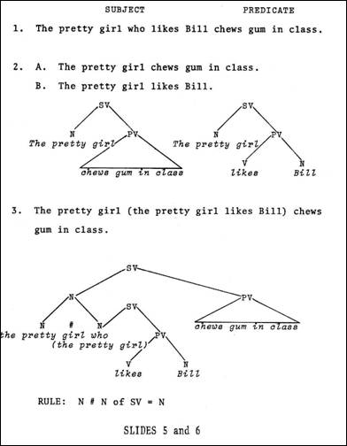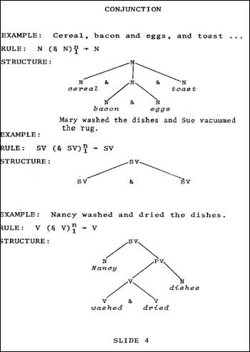 Conjunction (Slide 4), a second process reflected by J-rules, is the one we will discuss next. With this operation, either sememes alone or more complex configurations may be joined to a given node in a tree diagram to produce a sequence of like elements. This operation is traditionally referred to as the process of co-ordinating conjunction, and may operate on any node of a tree, as long as only categorially similar nodes are conjoined. In the second example of Slide 4, two full sentences are conjoined. Up above, note that it is a series of nouns - nominal expressions - which are being conjoined. It is not appropriate to conjoin unlike elements, such as a noun and a verb, for example. We do not say *The boy and running went home. The girl or some other noun can be conjoined to the boy but not a verb or some other construction. This type of rule - this conjunction rule – introduces into the grammar the property of recursion, which gives to language its ability to produce an infinite number of sentences of indefinite length and complexity. Subjunction rules - the next type of rule we will consider - also provide recursive power to the grammar, and correspond to the grammatical phenomenon known as subordination. Basically, subordination is the process of modifying a given element of language in such a way as to restrict, amplify, or clarify its referential scope. Let's consider some examples in a more traditional framework. We say that a relative clause modifies its antecedent, and modify, or modification, is the term we shall dwell on now. In the sentence of Slide 5, The pretty girl who likes Bill chews gum in class, who likes Bill is called a relative clause; and the so-called antecedent of this relative clause - the thing it modifies -- is girl.