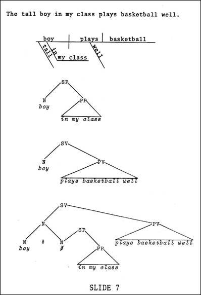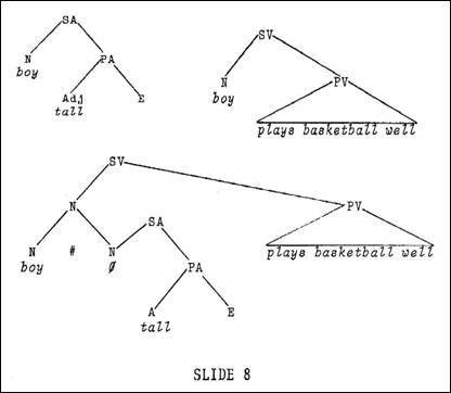 In this case we actually have two clauses within the sentence: The pretty girl chews gum in class and The pretty girl likes Bill. If we diagram these two clauses individually, we get the diagrams illustrated in Slide 5. And we also recognize that the whoof the original sentence in the second clause represents the individual person referred to as the pretty girl. Notice that the function of the relative clause is to restrict the discussion of pretty girls to only that one who likes Bill. And this is one instance of the process of modification, or if you will - subjunction. Now in a relative clause construction, it is easy to see that one clause overlaps or, as we say, intersects another clause at a particular point. In this sentence that we are considering, the noun subject of the second clause intersects with the noun subject of the first clause. Consequently, all of clause number two becomes part of the subject of clause number one. Our diagram indicates this (Slide 6 above). The subject of clause number one has the dominant N, which stands for the subject whose predication - if you will - is chews gum in class. If we reflect this overlapping - or intersection - in a diagram (such as the one we have) we simply combine the two clauses as shown. While combining the two clauses we have maintained our two basic structures and at the same time indicated the point of overlap, which is indicated by the triad of N's; we have indicated the operation of subjunction, which produces this overlap, by the double-cross juncture, which was the signal for subjunction. (The asterisk is now used in place of the double-cross juncture.) We have also indicated the fact that the pretty girl who likes Bill is the subject of the dominant sentence by introducing it into the tree on the N node which dominates the triad. It is appropriate at this time to point out the rule which accomplishes this subjunction. The rule is written at the bottom of Slide 6 and is read as follows: "to an N, subjoin the N of an SV, which yields a dominant node of the same kind, an N." And this is what we have accomplished in the diagram. A perusal of any relative clause construction will reveal this same relationship. We can consider a variety of relative clauses: We saw the boy who was here yesterday - here we have a subject subjoined to a direct object, for ex ample; The boy whom we saw was here yesterday switches it to where we have a direct object subjoined to a subject; and so on. In each case, one clause is modifying another. The clausal modification is not the only type of modification we find in language. Possibly even more common is the phrasal-type modification. We often refer to adverbial phrases or adjectival phrases or prepositional phrases which modify a specified element in a sentence. Consider the sentence of Slide 7: The tall boy in my class plays basketball well.