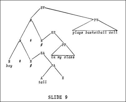 It is common practice in such a sentence to refer to the prepositional phrase, in my class, as modifying the subject, boy. In fact, traditionally we diagrammed it with just that idea in mind. Now if we are serious about modification being accomplished through the process of subjunction, we need to apply that process here. We noted earlier that prepositional phrases could function in a predicate relationship to various sentence elements, and in this case perhaps we will find it can function predicatively to a noun. Our adjunction construction would look like the example in Slide 7. This is an adjunction construction, showing the prepositional phrase predicating the noun. (This is what we talked about earlier.) Boy, however, also serves as the subject of the predication plays basketballwell, as is also shown in the slide. Obviously we have two adjunction structures that overlap, that share an element in common. That is what we had in our relative clause sentence, so, following the modificational procedure, we subjoin the phrase boy in my class to the clause boy plays basketball well at the point of overlap. This yields the tree diagram shown at the bottom of Slide 7. The only difference between this subjunction and the relative clause subjunction is that, in English, relative clause subjunction is signaled by an overt lexical marker, such as who or which or that - the things we call relative pronouns. Prepositional phrase subjunction, however, does not have any such overt signal, in English. Nevertheless, we do have modification with an intersection between clause and phrase, and that is the issue. Incidentally, it might be appropriate to point out that in Samoan there is characteristically no relative pronoun marker; but, quite frequently, other types of subjunction markers are manifested. This failure to lexicalize a given node is indicated on the tree diagram by the null symbol (Ø), as shown. Returning to the sentence we just considered, we note that the prepositional phrase, in my class, is not the only modifier of boy. The adjective tall is also a modifier. Again we recall that adjectives stand in a predicate relationship to nouns, as is shown in Slide 8.