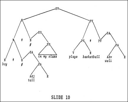 We have the same adjunction configuration that we have with prepositional phrases, only this time it is an adjective rather than a preposition which functions predicationally with boy. Again applying the principle of subjunction, we combine this adjunction configuration with the SV construction, and the result is as shown. Since the prepositional phrase discussed previously modifies tall boy rather than just boy, we include it in the tree diagram above the subjunction of the adjective to indicate the proper relationship of the two subjoined elements (Slide 9).In other words, since in my class is subjoined to the N node dominating tall boy, the tree diagram is to be read such that tall boy is modified by in my class; i.e. the entire lower configuration is modified by the prepositional phrase. By now it should be obvious that the manner adverb well, that modifies plays basketball, can be handled in essentially the same way (Slide 10).