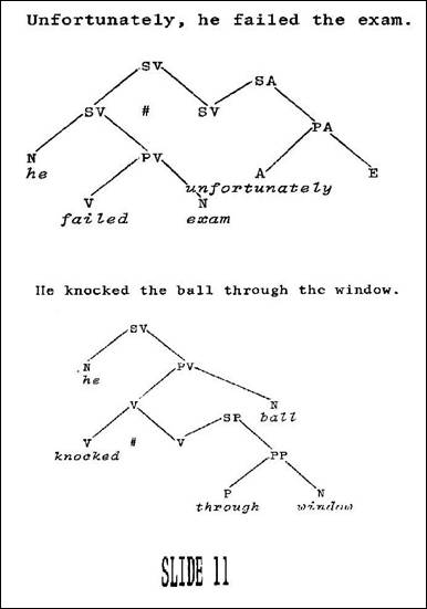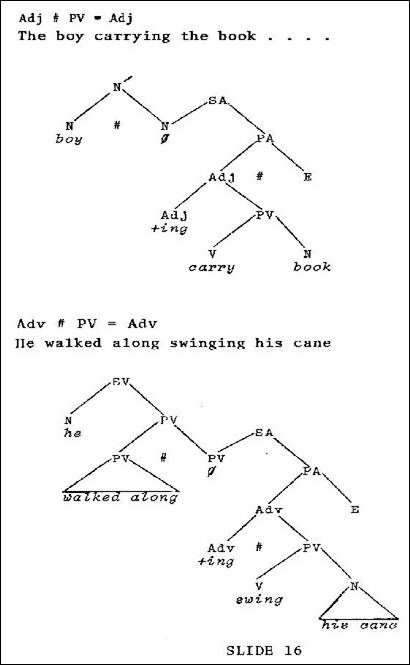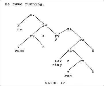 The boy carrying the book ... (Slide 16). Notice this active participle, where we subjoin an entire SA construction to a noun; in other words, we are modifying this noun by an adjectival construction. The adjective is signaled by the We can do the same thing with adverbs that we do with adjectives. He walked along, swinging his cane (Slide 16). Swinging his cane obviously modifies how he is walking. It functions in this modificational way, and is subjoined as an adjective to the PV - I'm sorry, an adverb. Let me note at this point that according to the theory, the only distinction between adverbs and adjectives is in terms of what they modify; and if you consider your traditional approach to grammar, we call those things that modify nouns adjectives (and that is how we define adjectives - they are things that modify nouns), and we call every other kind of modifying element an adverbial element (it does not modify nouns -- it modifies other things). And so if I confuse them or if I have not noted specifically whether it is an adverb or an adjective, it is because within the theory this is not significant. One final slide which indicates essentially this same thing (Slide 17). Here is a verb being adjectivalized with an -ing ending. He came - in what fashion? - he came running. And we have this typical subjunction configuration, which builds this construction in a straightforward way.