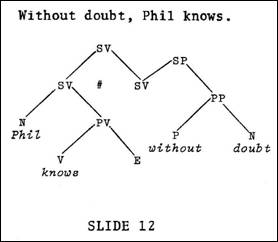 It should he noted that adverbs may function predicationally on all levels of structure, on the sentence level in such sentences as Unfortunately, he failed the exam, where the adverb unfortunately modifies the entire sentence, he failed the exam (Slide 11) - or on the predicate level, as in the sentence we just considered, The tall boy plays basketball well, where well modifies the so called predicate, plays basketball. And we can go on and show that adverbs may modify verbal elements on a verbal level, as in the sentence He knocked the ball through the window (Slide 11). The prepositional phrase here, an adverbial element, is modifying knocked rather than the entire PV structure, which would include knocked and ball. These different positions of modification allow for a discreet and principled way of identifying such types of adverbial elements as manner adverbials, adverbs of location or destination - i.e. the various kinds that we recognize as existing in language. Slide 11 also illustrates the fact that, like the so-called pure adverbs, prepositional phrases which function adverbially may modify sentence elements other that nouns, as we saw originally. Here a prepositional phrase is subjoined to the verb knocked. In the sentence Without doubt, Phil knows, we have an example of a prepositional phrase, without doubt, modifying an entire sentence, Phil knows (Slide 12).