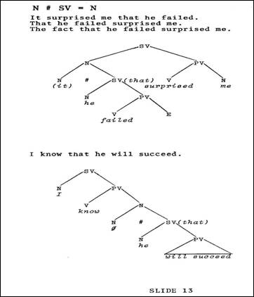 At this point in our discussion we should call attention to the fact that, in each example of subjunction we have considered, there has been the characteristic triad comprised of two subjoined elements and the dominating node, which categorizes the subjunction. In each case the elements subjoined have been of like category, both nouns, or both verbs, or both PV's, as in the last case. And this type of subjunction - that achieved between elements of similar category we designate as homogeneous subjunction. Let's now consider a type of subjunction referred to as heterogeneous subjunction, wherein the subjoined nodes are of different categories. Let's consider, for example, the sentence It surprised me that he failed (Slide 13). Careful consideration of the two clauses involved leads one to the conclusion that the second clause, he failed, serves to amplify the subject of the first clause, which is, of course, it. In fact, the noun subject it receives its referential value from the entire clause, he failed. This identify of reference is precisely the same thing we noted as overlap in the relative clause construction considered earlier. Mere the overlap is between a noun and an entire sentence rather than between two nouns. Our diagram clearly shows the heterogeneous nature of the two nodes joined in the subjunction operation.