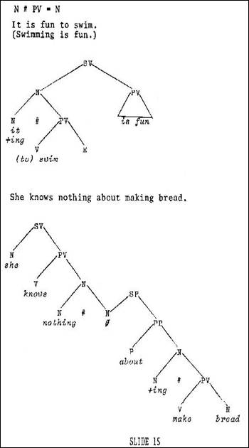 Notice that in the sentence of Slide 15, the rule above indicates we have a PV subjoined to an N dominated by an N, and functioning as the subject of the SV. We can say It is fun to swim, and the value of it, of course, is swim 'Swim' is fun; and we properly say swimming when we make such a verb a noun. If we do not use the -ing structure, we can say alternately To swim is fun, and to in this case signals the nominal function of the verb. Or we can give the sentence as it is shown, It is fun to swim. She knows nothing about making bread (Slide 15 above). This sentence, again, has this subjoining on an N. But it is not an SV that is being subjoined; it is a PV. Make bread is a predicate construction. And we want to nominalize that predicate construction by subjoining it to an N, whose signal is -ing, which - in terms of lexical order - is attached to the verb; and all of this functions as the noun object of the preposition.